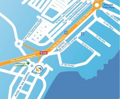 Para su mejor localización cabe decir que está situada justo en la misma rotonda que la farmacia de Campoamor. Una vez cruzado el puente para acceder a la zona de Aguamarina basta con mirar al frente y a la derecha  para ver el cartel azul distintivo de Community Solutions.